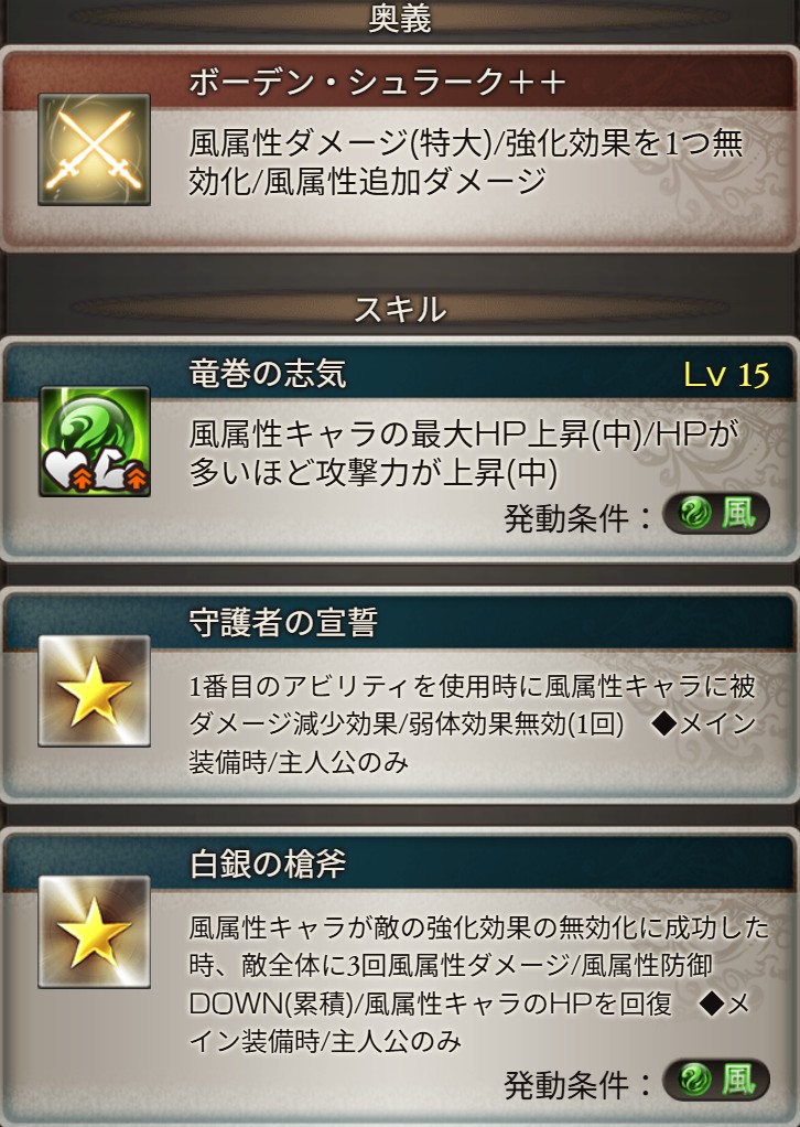 不死鳥の灯火は火属性でスワンと天風の鋭輪は風属性。
