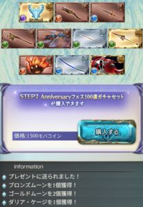 ちなみにステップアップアニバフェスもステップアップクラシックフェスも段階的に課金額が上がるシステムなので、100連までなら500モバコインと超お得\(^o^)/