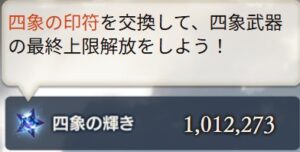 となって、それが4種類あるので1回の開催で印符を取り切るのに必要なの四象の輝きは1480000になります。